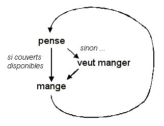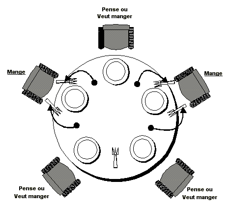 De temps en temps, un philosophe a faim et essaye de prendre les couverts qui sont immédiatement a cotés de lui (ceux qui sont entre lui et son voisin de gauche et de droite). Un philosophe a besoin de deux couverts pour manger, et ne peut évidemment pas prendre un couvert qui est dans la main d'un voisin.
