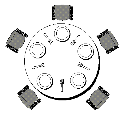 Considérons cinq philosophes, installés autour d'une table circulaire, et qui passent leurs temps à penser et à manger.
