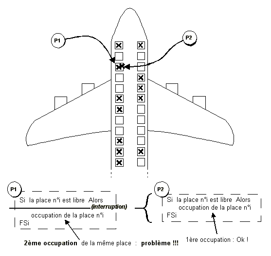 Considérons deux processus (ou plus) qui s'exécutent concurremment dans un environnement multitâche, et qui sont chargés de la réservation de places d'avion. Le système d'exploitation leur accorde à tour de rôle un temps d'exécution.
