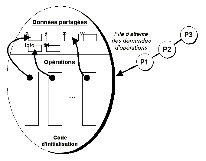Les processus, lorsqu'ils désirent effectuer des traitements sur les données communes, expédient une demande au moniteur en appelant l'opération correspondante.